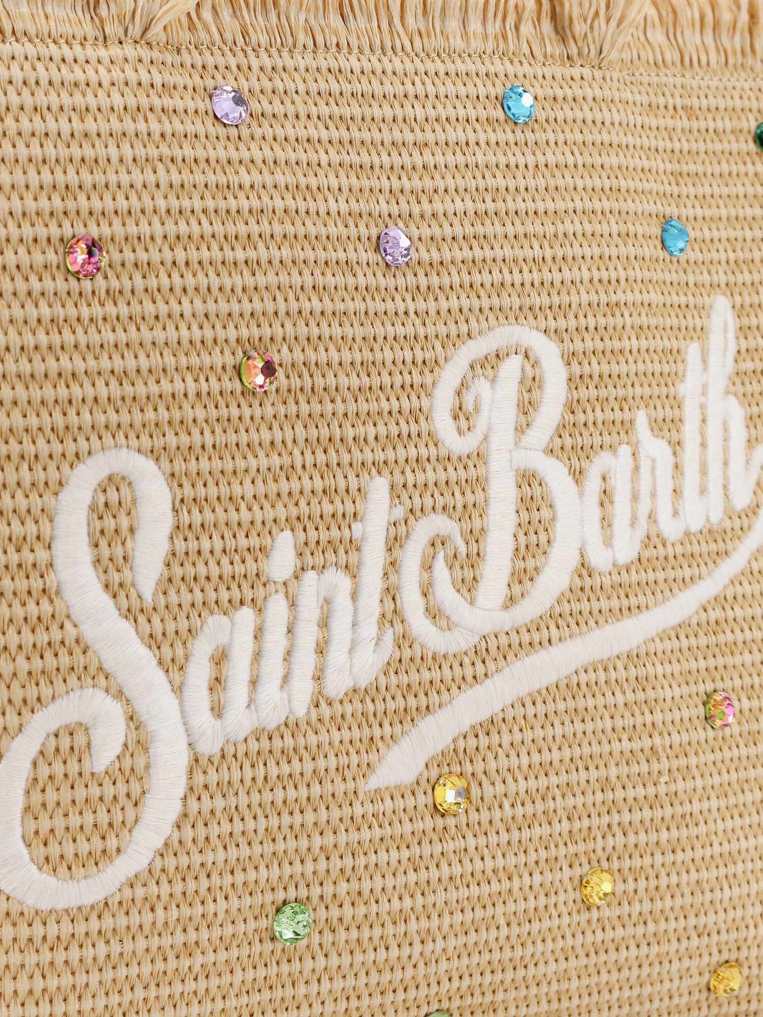 Vanity Straw raffia handbag with multicolored rhinestones